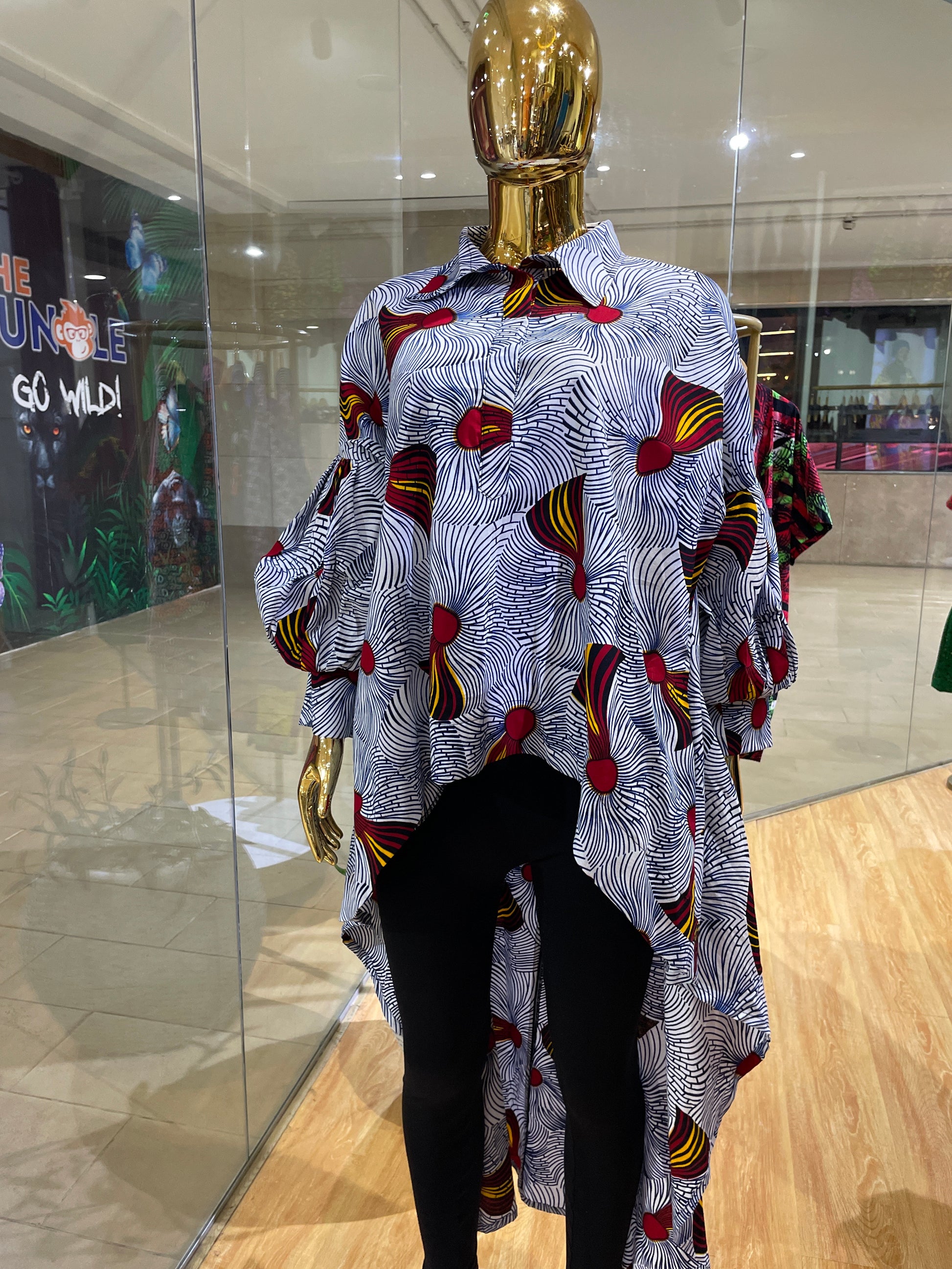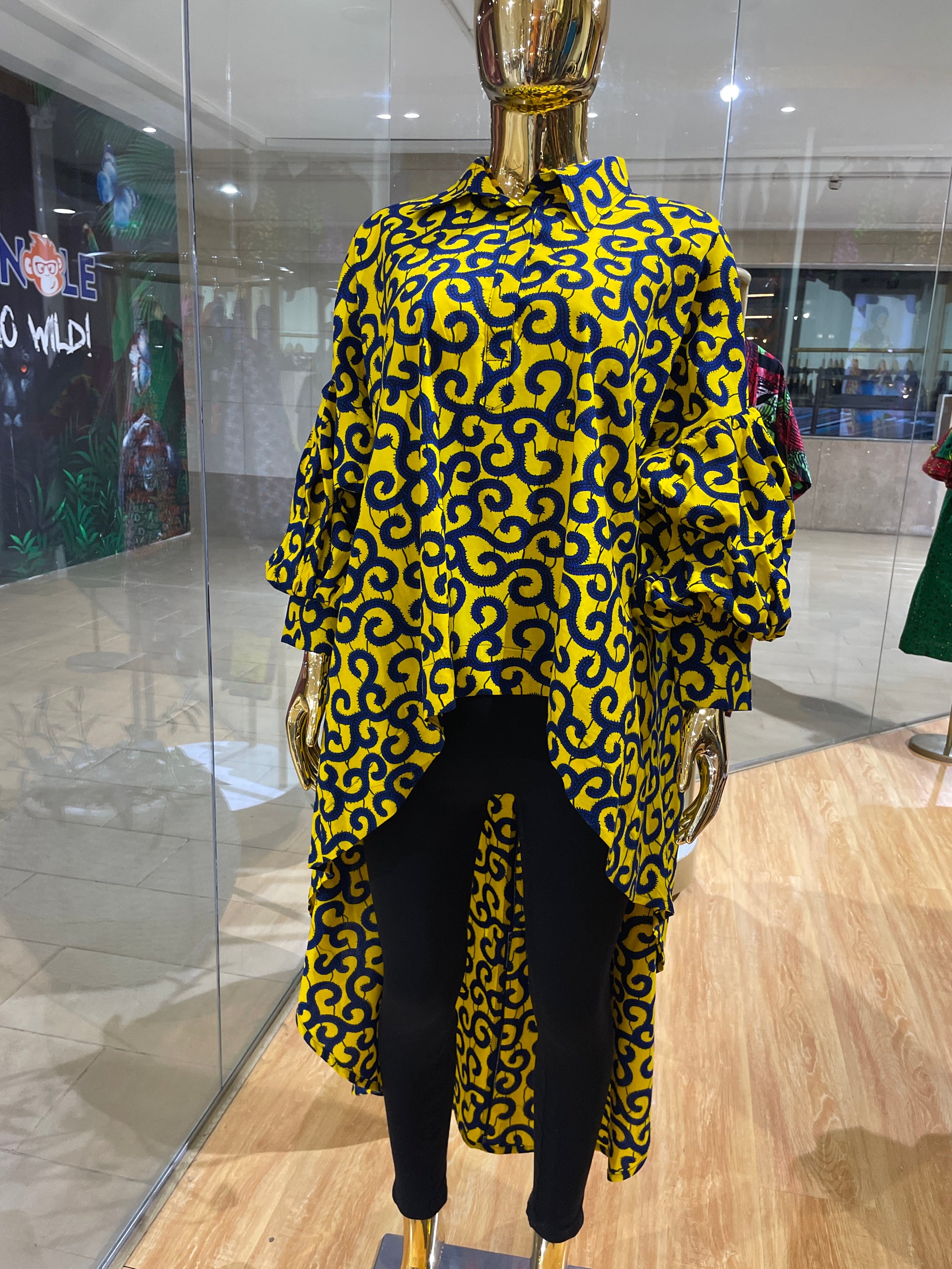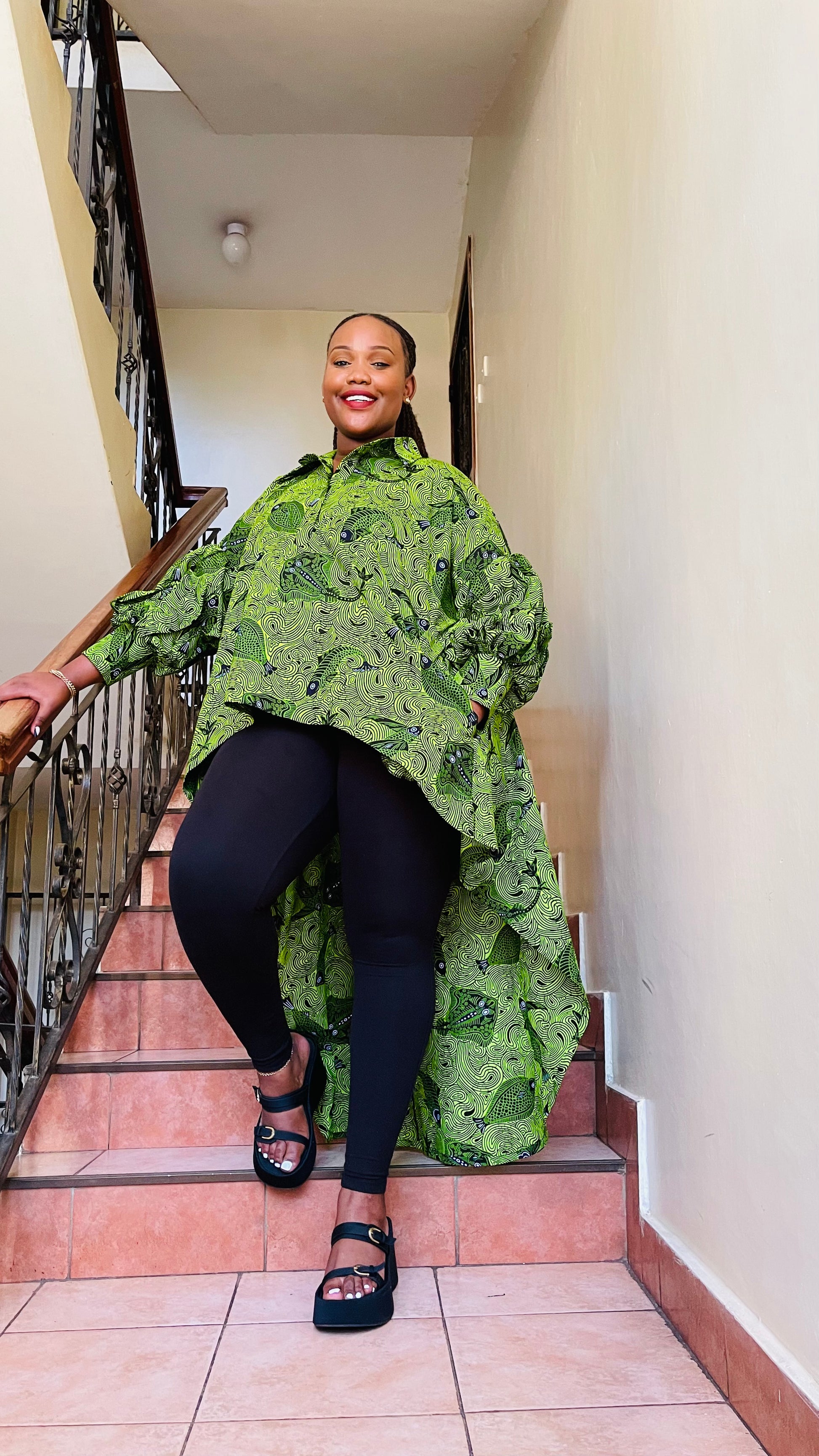 A hi-low flare African print shirt with exaggerated sleeves and hidden pockets. One size fits all. Comes in various prints. Swipe to choose.