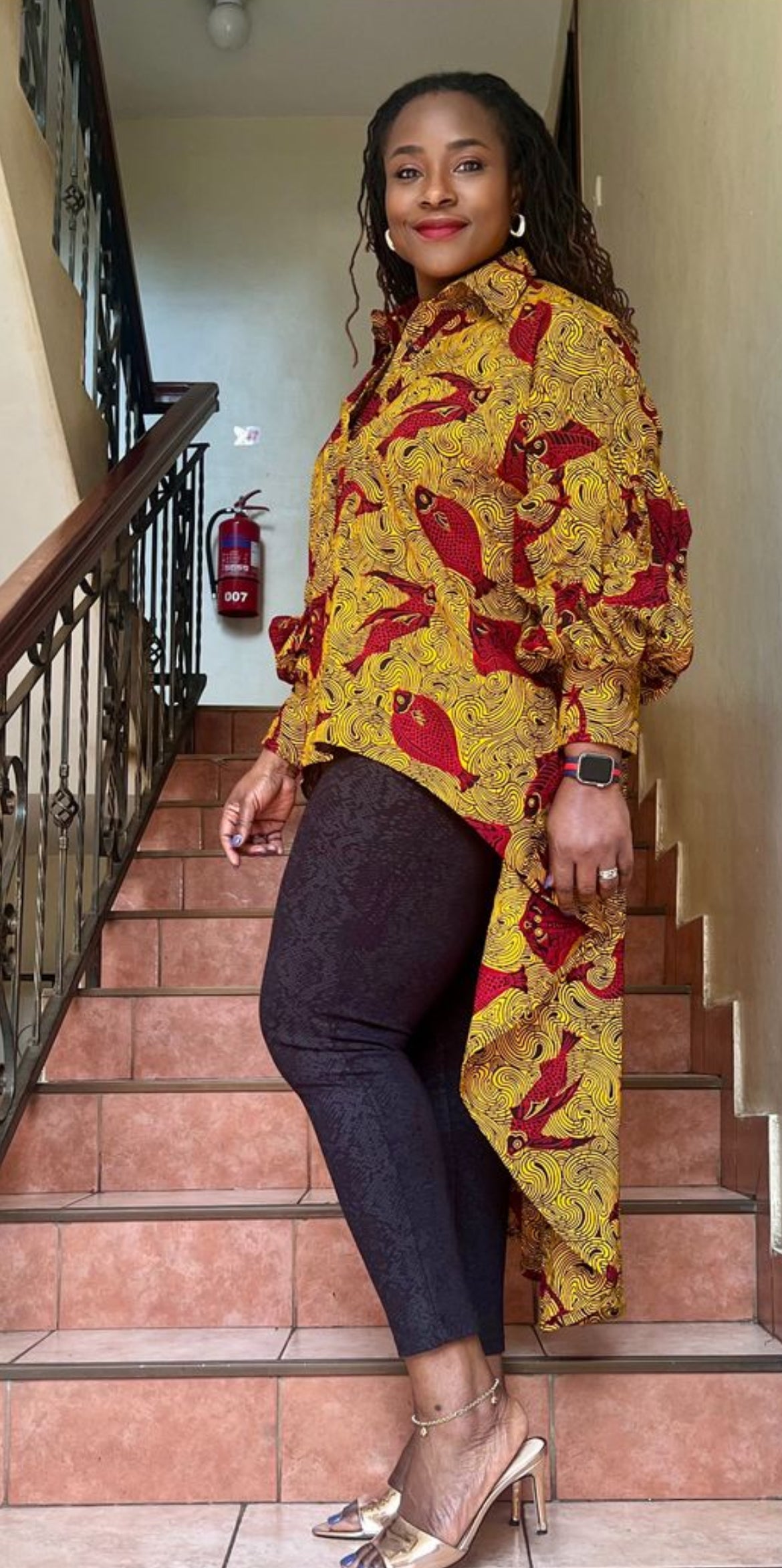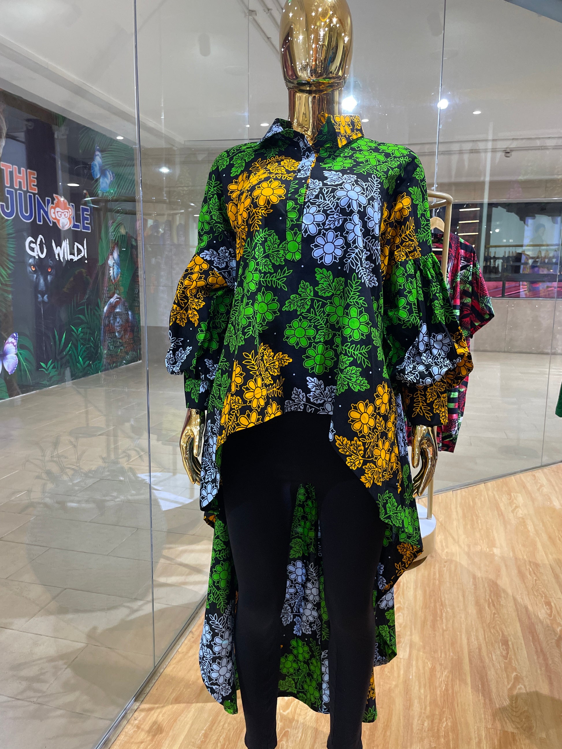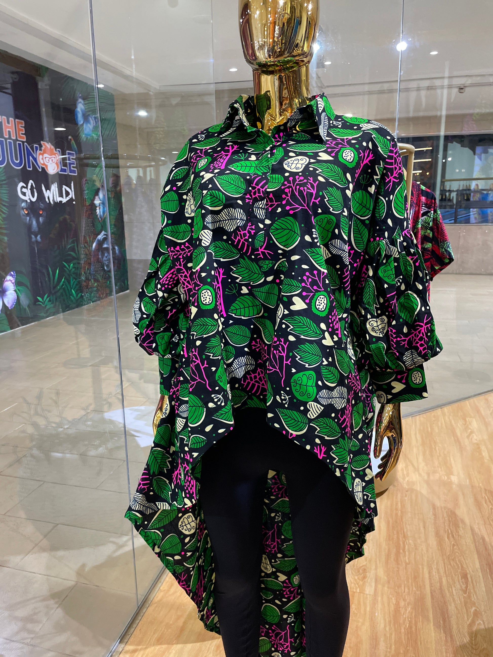 A hi-low flare African print shirt with exaggerated sleeves and hidden pockets. One size fits all. Comes in various prints. Swipe to choose.