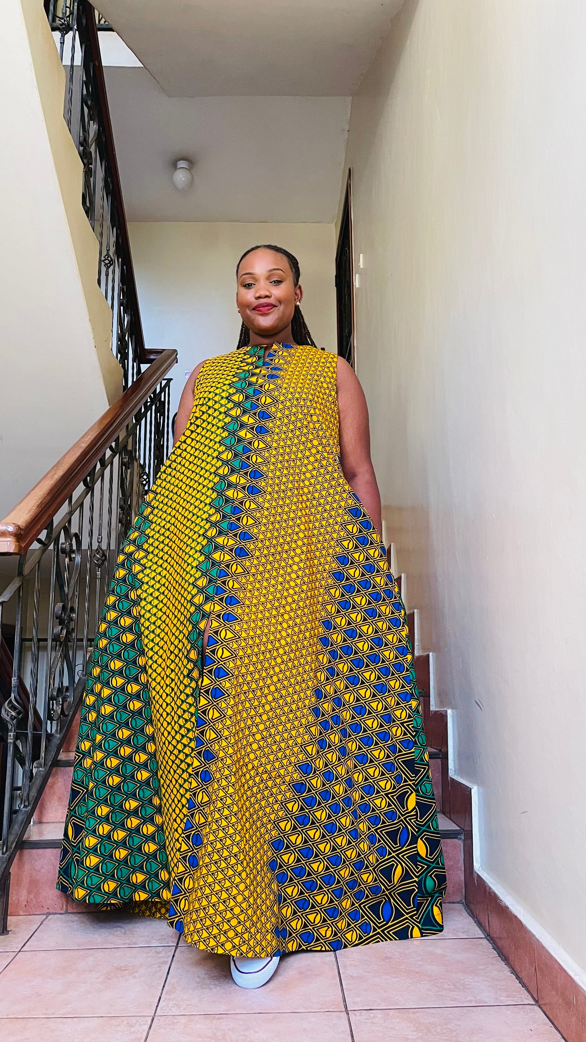 Split down the middle with mixed Ankara prints, this sleeveless floor length full flare dress has a tunic neckline, and hidden pockets. Available in all sizes and alternative print mixes.